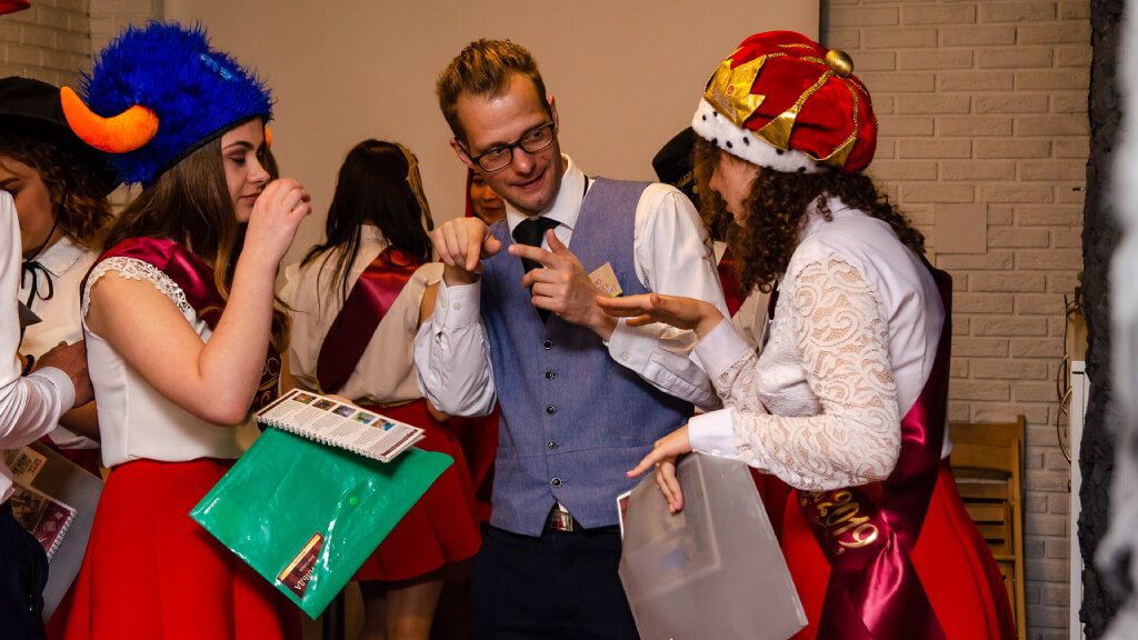 Квест на выпускной «Ночь в музее»: Иван Грозный царской рукой дарит милость, вручая всем своим оппонентам по фруктовому пирогу, что вызывает смешанные чувства от благодарных и испуганных гостей.