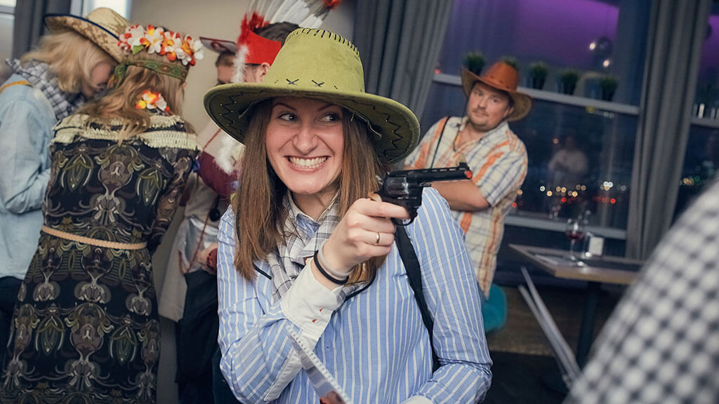Играйте, не выходя из офиса! Ведущий приедет к вам, привезет все необходимое и превратит привычный интерьер в необитаемый остров, ковбойский салун или другую планету. Вам нужно только собрать коллег, подготовить угощение и впустить к себе праздник.